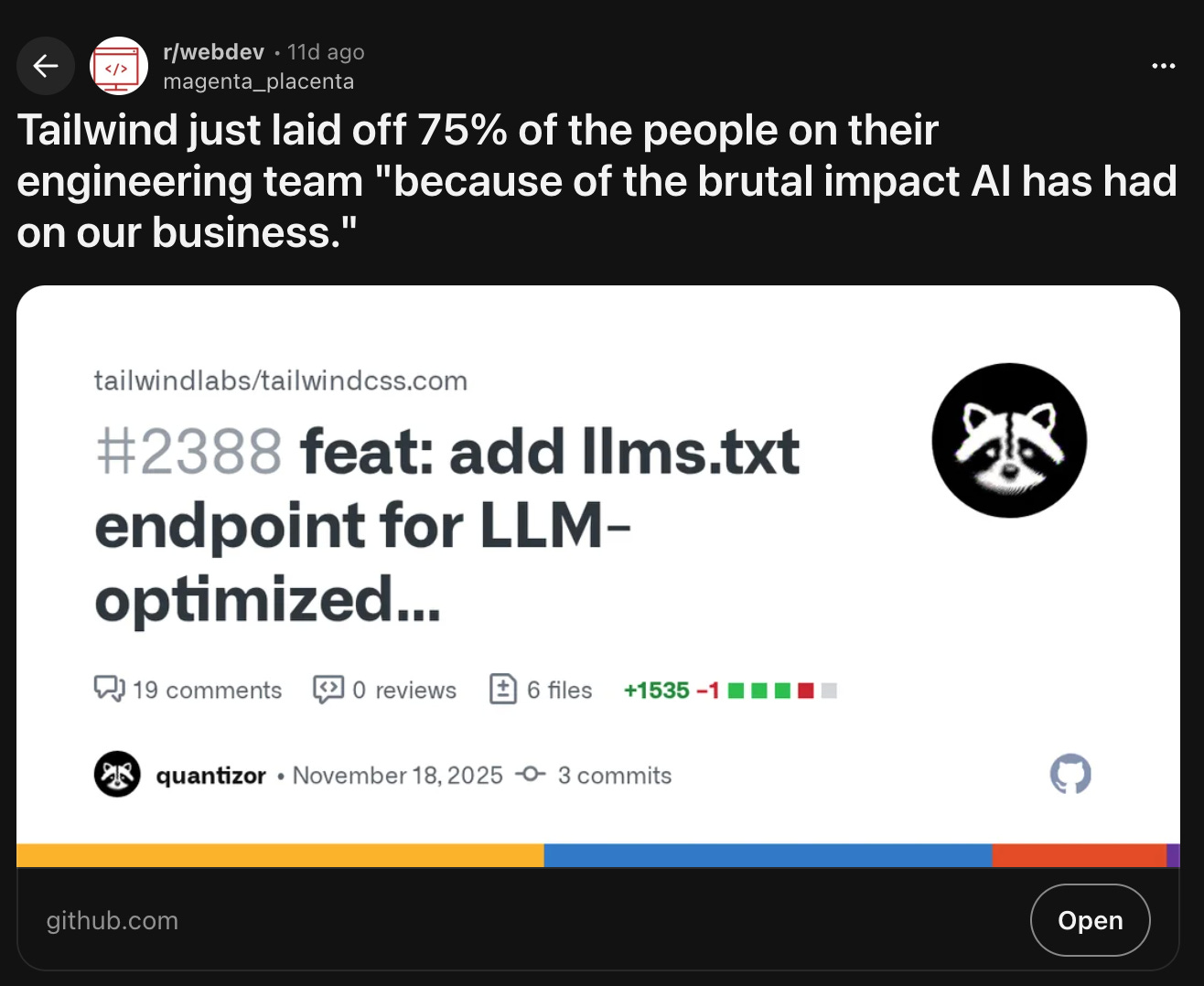 https://www.reddit.com/r/webdev/comments/1q6n1za/tailwind_just_laid_off_75_of_the_people_on_their/